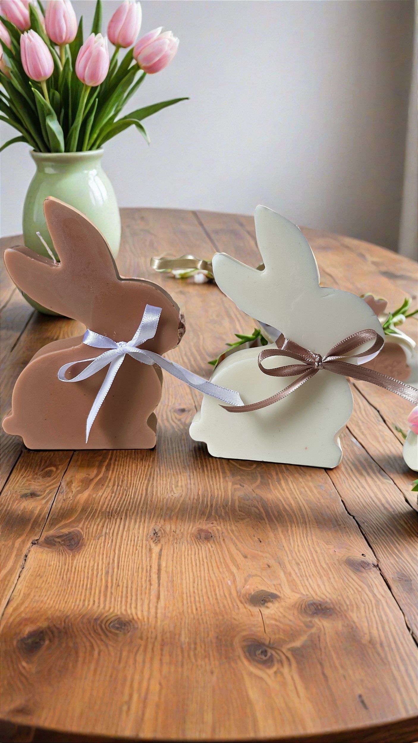 Nosso duo traz coelhinhos sem aroma podem ser coloridos ou feitos na cor natural da cera, o que melhor couber na sua decoração. Acompanham saquinho de algodão com fita, nossa tag linda e também um cartão de cuidados com as velas.